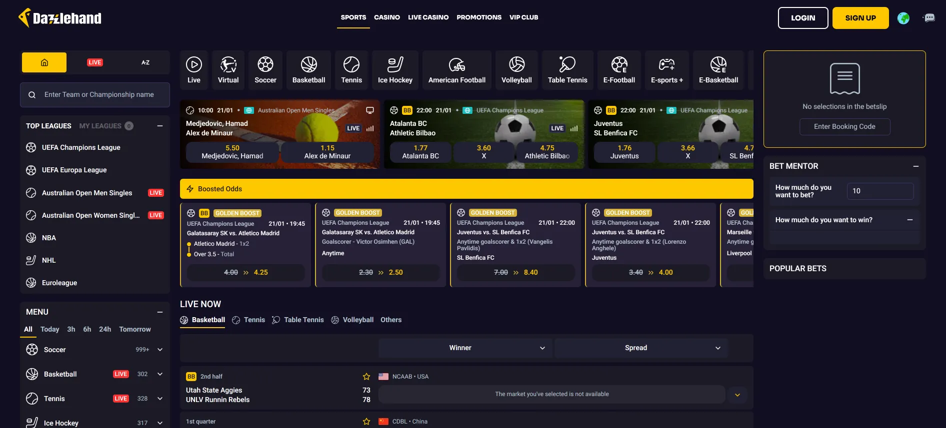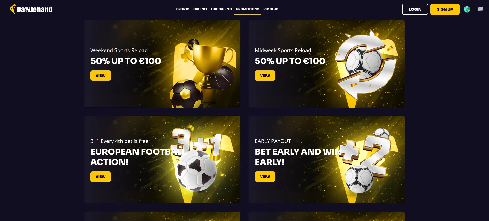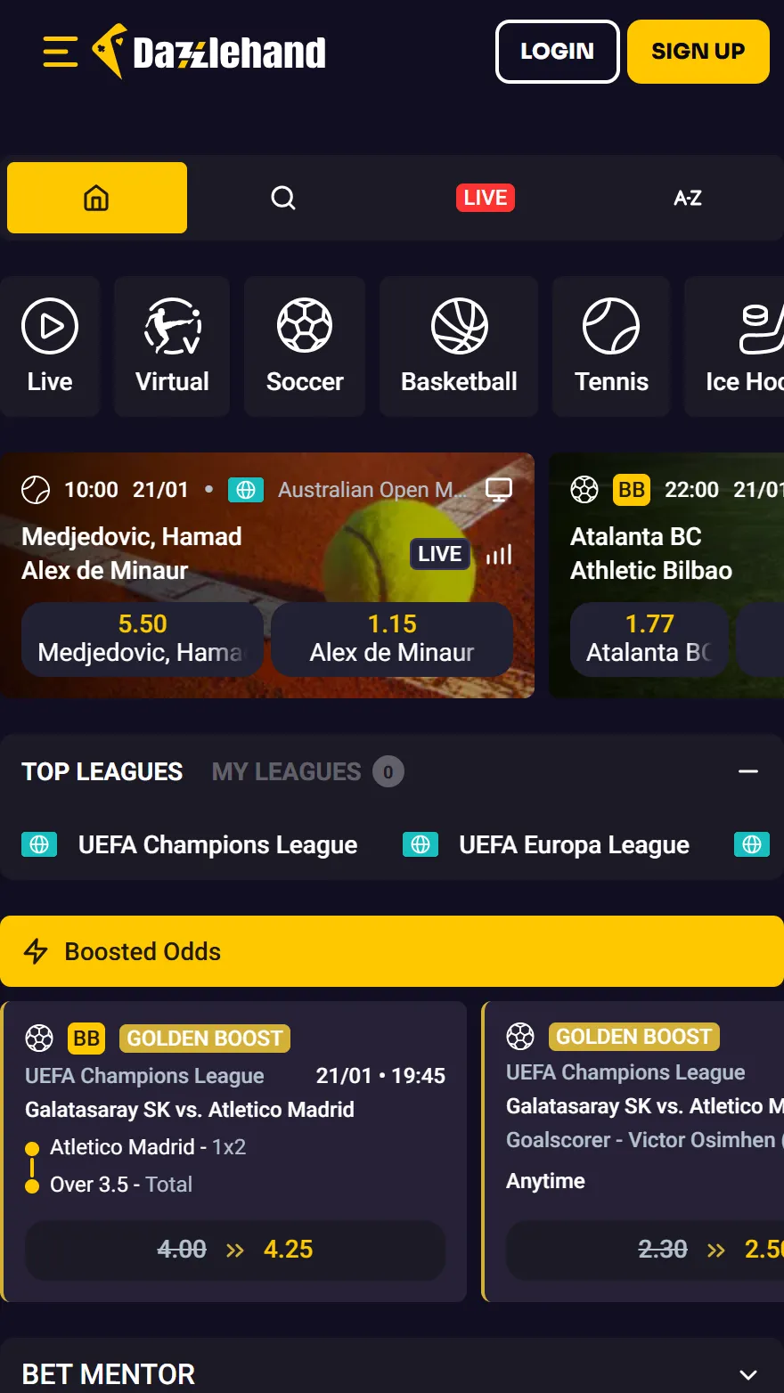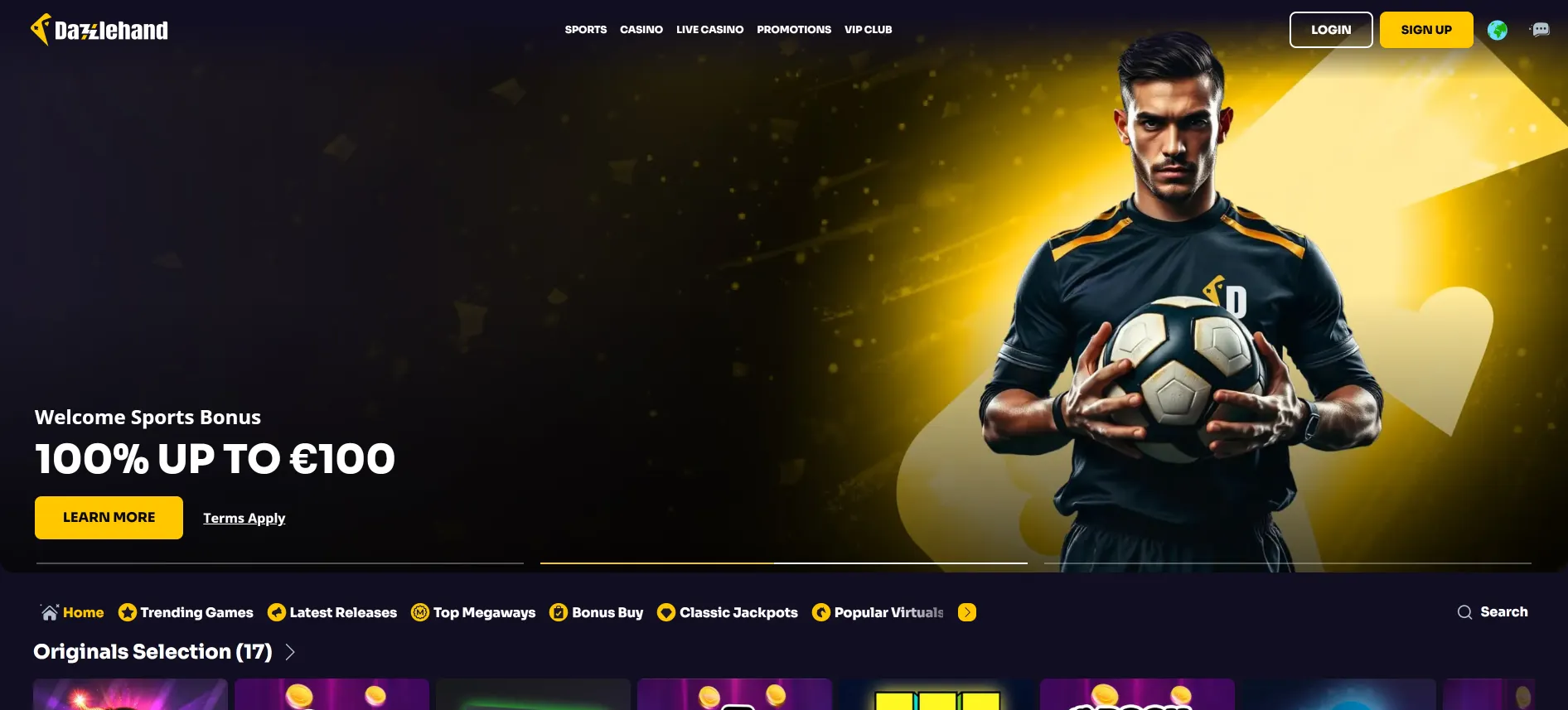Dazzlehand выделяется очень широким выбором спортивных событий и ярким, энергичным дизайном, где всё ориентировано на быструю игру. Меню охватывает как самые популярные лиги, так и нишевые виды спорта и киберспорт, а live-раздел поддерживает постоянную динамику в течение всего дня. Платформа стабильно работает как на компьютере, так и на мобильных устройствах, а различные функции – ранний вывод средств, возврат денег и специальные возможности для комбинированных ставок – добавляют гибкости для повседневной игры. Деятельность сервиса регулируется мальтийским регулятором, что в целом создаёт ощущение надёжности и упорядоченности.